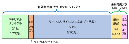日本では、ペットボトルなど一部の分野でリサイクルが進んでいるものの、製品の原料として再利用されるマテリアルリサイクルおよびケミカルリサイクルの割合は、あわせてわずか25%にとどまります。対照的に、焼却によってエネルギーを回収する「サーマルリサイクル」が全体の63%を占めていますが、実は欧州ではリサイクルとは認められていません。