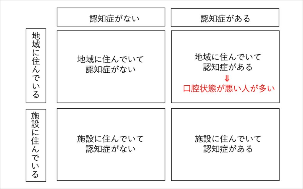 また、認知症があっても施設に入っている方は、スタッフがケアをするので清潔さは維持されますし、一つの場所に集まっているので研究もしやすいです。さらに、認知症がなくて施設に入っている方というのは自分で困りごとを訴えられるので、比較的口腔内の環境が維持されています。