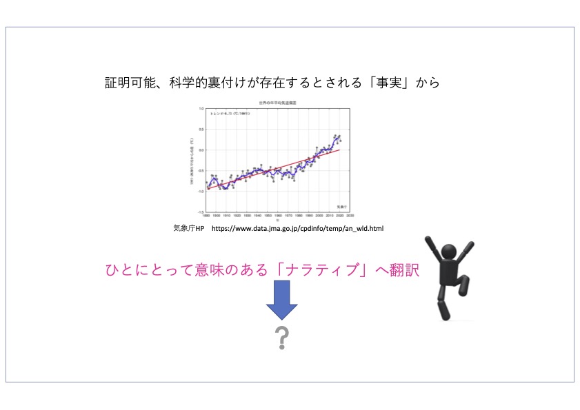 翻訳は、相手の言語習慣、興味や立場に合わせて何をどう共有するかを調整することであり、サイエンスコミュニケーションを翻訳として見ることはよい戦略だと思う。サイエンスコミュニケーション初期の1980年代、科学を易しく正しく伝えることで、科学の意義がもっと一般市民に評価してもらえることが期待されていた。が、そうして科学的知識を得た後も、人は懐疑心や批判的姿勢をそう簡単には崩さないという調査結果が英国で報告されている。科学的情報へのアクセスが、必ずしも安心、尊敬、共感、モラル、イデオロギーといった人の心理と価値判断に直結しないことは明らかであり、その理由は必ずしも「伝達の失敗」「理解の結度」ではない。ユーザーが自分なりに情報に接続したとき、それをどう評価するかは主体的、個人的な力仕事になる。それが何かに響く、何かを変えるトリガーとなり得るサイエンスとはどういうものか、とらえどころがない。こうした不安定さ、不確実性をふまえた上で、科学的事象を出発点に翻訳し再構築するサイエンスコミュニケーションは、科学コミュニティにとって挑戦的であり、翻訳行為としてもクリエイティブである。