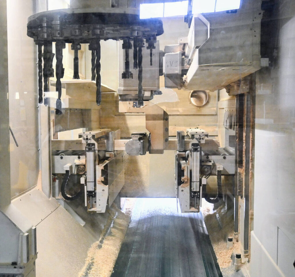 高効率な生産体制を支えるのが、先進的な設備だ。特に、6軸制御多目的加工機は、これまで大工技能を持つ作業員が複数人で行っていた複雑な加工を、プログラム制御により1〜2名で対応可能にした。これにより生まれた人員の余裕を他の工程へ再配置することで、工場全体の生産性を向上させた。